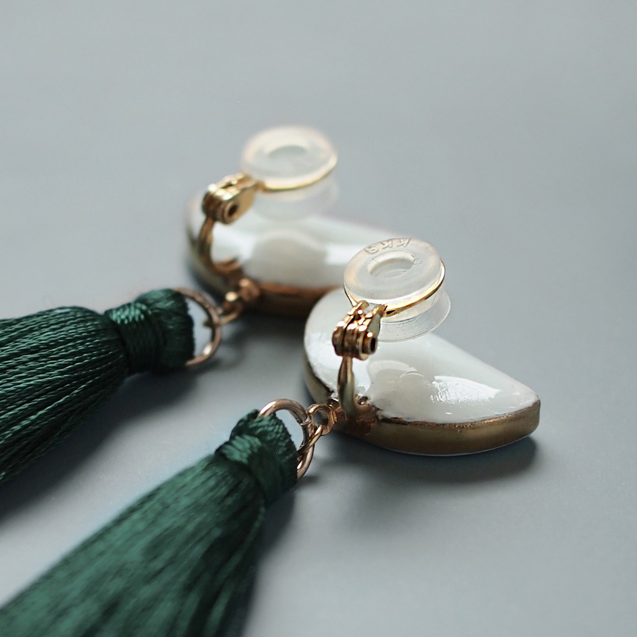 作家の手仕事で一つ一つ丁寧に作られており、着けると耳元から華やかな存在感を放ちます。純白の半月型の陶磁器に光沢のあるタッセルがとても上品で揺れるたびに上品な輝きを放ちます。